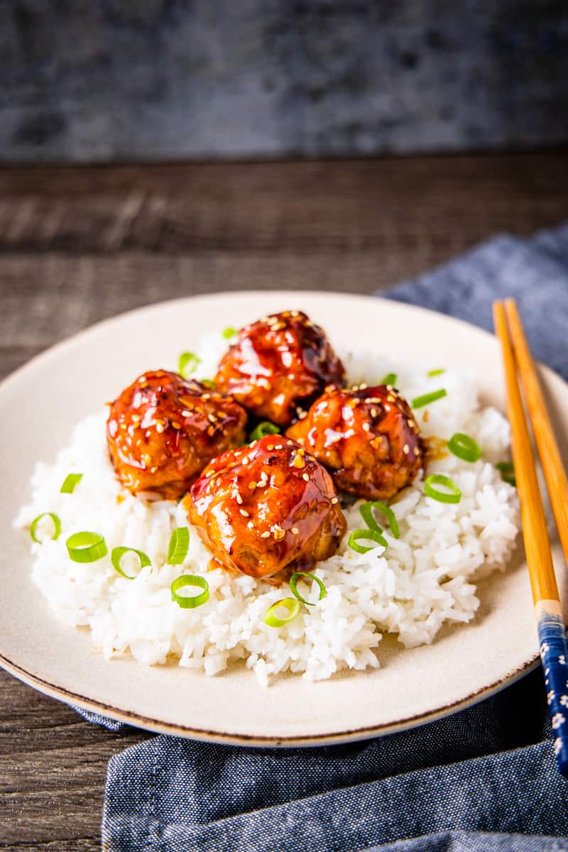 These tasty chicken meatballs are coated in a sweet and savory sauce, similar to teriyaki sauce. They're a perfect option for a quick and easy weeknight dinner the whole family will love!