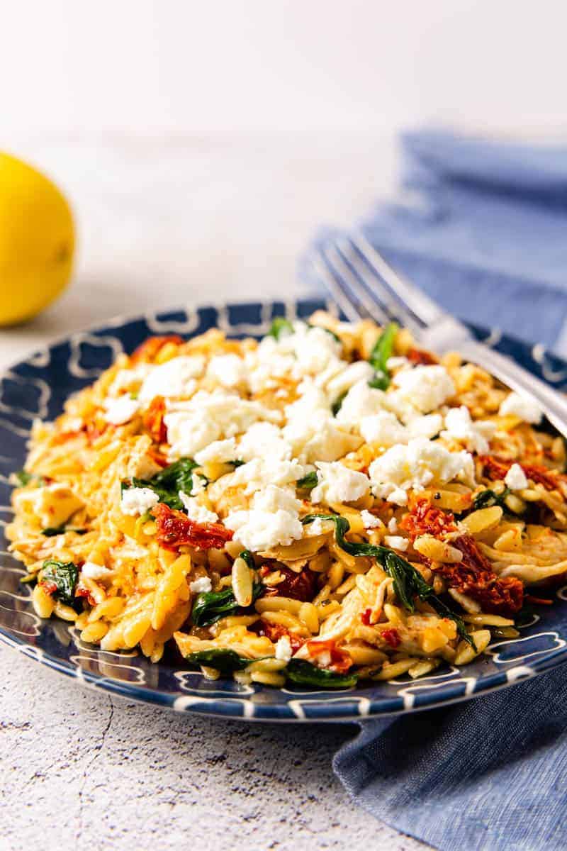 This Mediterranean chicken orzo is a tasty one pan dinner that's packed with marinated lemon chicken, sun-dried tomatoes, and spinach all combined with orzo pasta for a well balanced meal in just 30 minutes!.