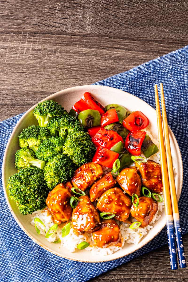 1 cup rice 1¾ cup water 1 medium green pepper 1 medium red pepper 3 teaspoons cooking oil 1½ pounds chicken breast 3 cups broccoli florets 1 teaspoon sesame seeds 1 Tablespoon chopped green onion Teriyaki Sauce ⅓ cup low sodium soy sauce 1 teaspoon sesame oil 1 Tablespoon rice vinegar 1 teaspoon ginger 2 cloves garlic ¼ cup brown sugar 1 teaspoon cornstarch